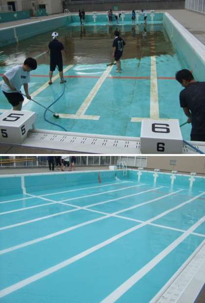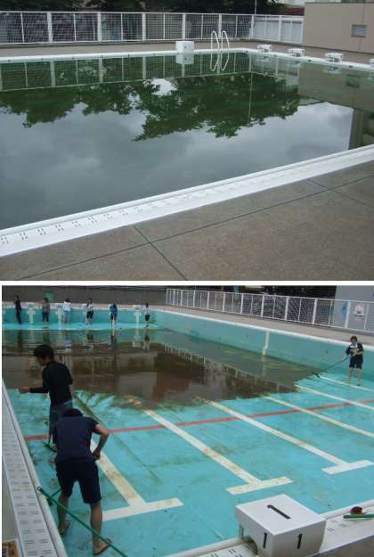 いよいよ17日(月)からプール水泳が始まります。 放課後には、職員でプールの底や側面を清掃しました。最初は、水はぬるぬるで汚れていて臭いも強かったです。みんなで端の方から水で流しながらこすっていき、きれいにすることができました。明日、子どもたちが登校してくるころにはきれいな水が入っていると思います。
