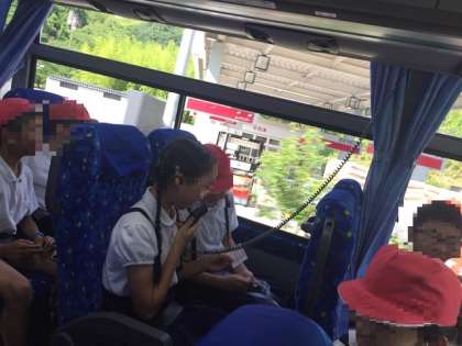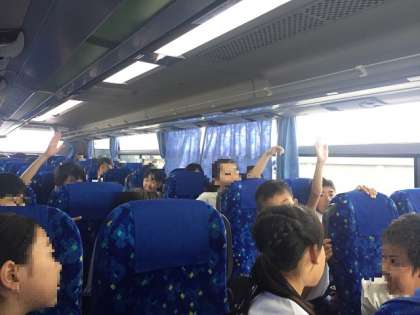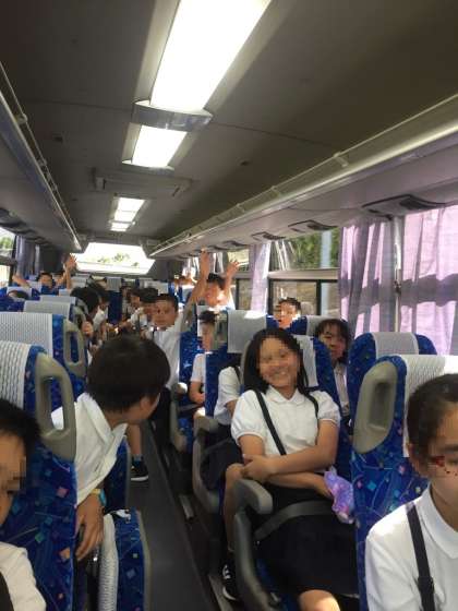 海洋センターに向けて出発しました。バスの中でクイズをして楽しそうです。