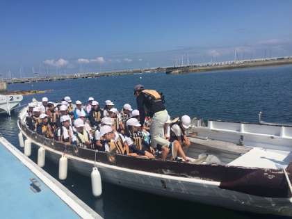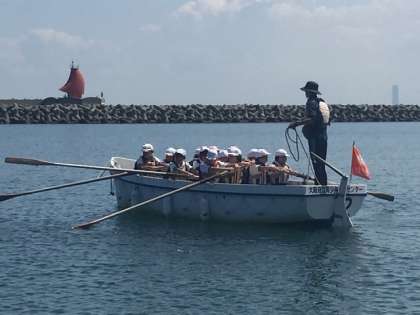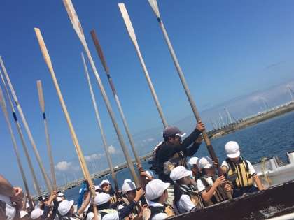 今からカッター体験を行います。カッター訓練AB班です。ライフジャケットを付けて出発します。大きな櫂を動かすのは大変なようです。