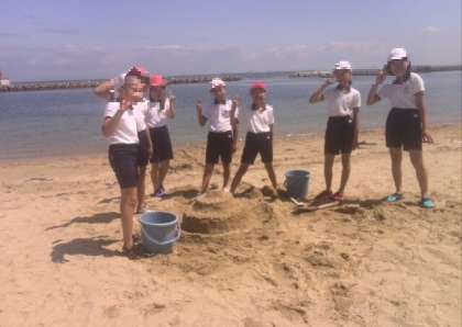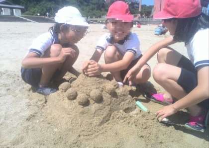 サンドアートでお城などを作りました。みんなで協力して大きな砂の造形を作れました。