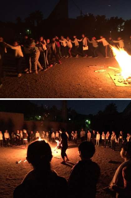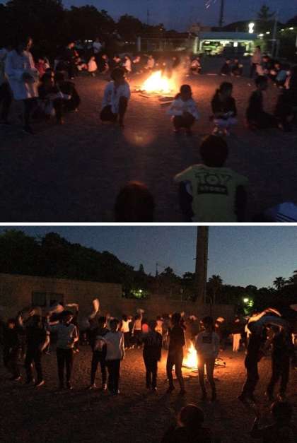 キャンプファイヤーで、子どもたちが考えた劇やダンスを踊って盛り上がりました。。最後は火の神から授かった炎を星の形にして今日1日を振り返りました。