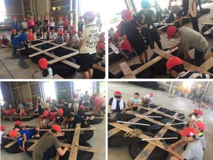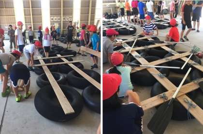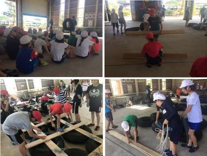 タイヤと板とロープでいかだ作り始まりました。ロープの結び方を真剣に聞いています。みんな力を合わせて取り組んでいます。