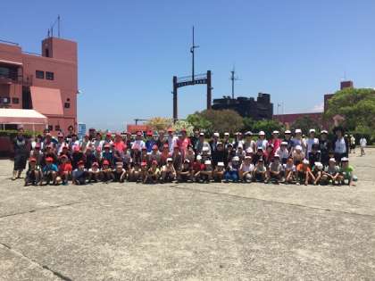 午前中の活動、いかだ作りの後の学年全体写真です。みんな満足そうな顔ですね。