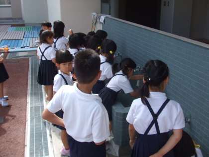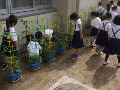 1年生は校舎の南側でアサガオを育てています。毎朝、ペットボトルで水をあげているので大きくなってきています。。そして、横にはみ出たツルを支柱にもどして上に伸びるようにもしています。1年生みんなでもっともっと大きく育つようにがんばっています。きれいな花がたくさん咲くといいですね。
