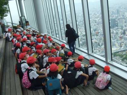 60階での活動が終わって、58階のテラスでトイレ休憩をしました。みんなでクラスごとに記念撮影もしました。みんないい笑顔でした。