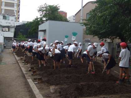 長池小学校では、農薬や化学肥料を使用しない有機無農薬栽培をしています。6年生が、腐葉土と堆肥を農園の土と混ぜました。これによって土の中に空気が入り、通気性がよく水はけのよいフカフカの土にすることができます。