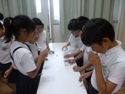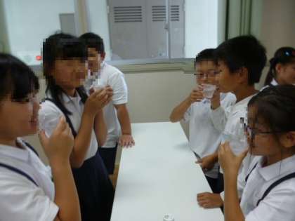 実験のあとは、「浄水場の水」と市販で売っている「天然水」を飲み比べました。何と37対36という僅差でしたが、「浄水場の水」に軍配が上がりました。