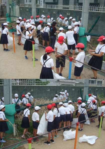 こういうふうに「田辺大根」の種が茶色になると、鳥たちがネットからはみ出した部分の種を食べ始めます。梅雨になり雨が降り出す前に、6年生が総合の時間に収穫をしました。今年はどんな「田辺大根」が育つか楽しみですね。