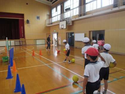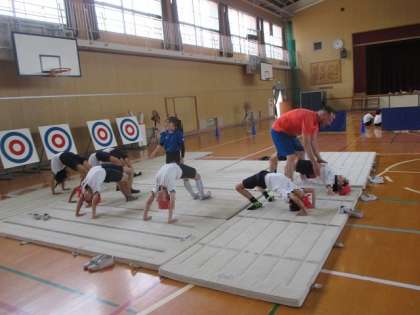サッカー名人にはボール慣れからサッカーのドリブルの仕方を、マット体操名人には前転・後転と側転を教えていただきました。