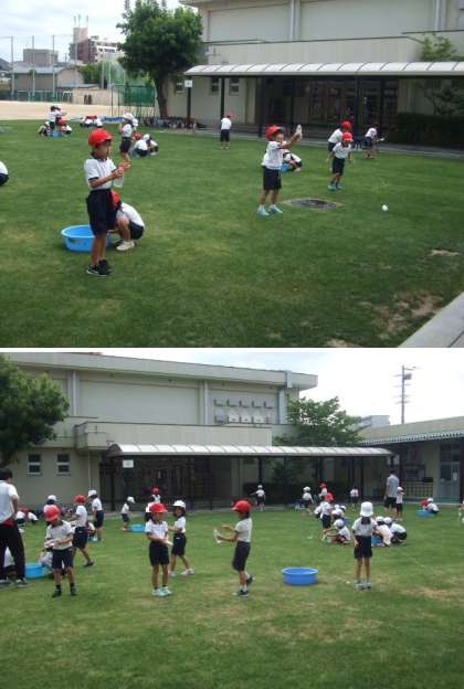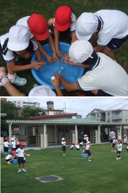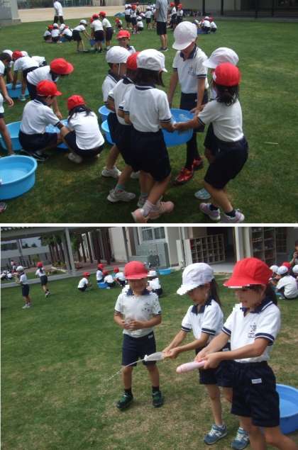 1年生「水遊び」の1回目です。今日は、梅雨の晴れ間で暑かったので、水遊びをしました。ペットボトルやマヨネーズの容器を使って、水の飛ばし合いをしました。
