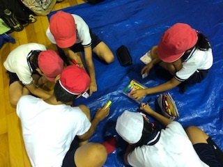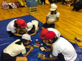 みんなで教えあいながらメンコを作っています。できたメンコに自分で絵をかきます。