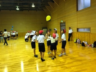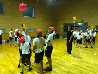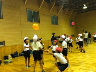 風船ゲームをしています!みんなで円になって手を繋ぎ、落とさないようにします。