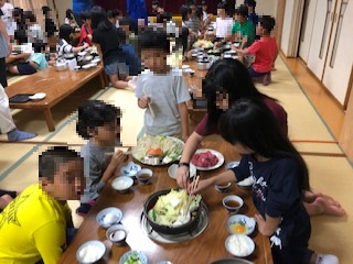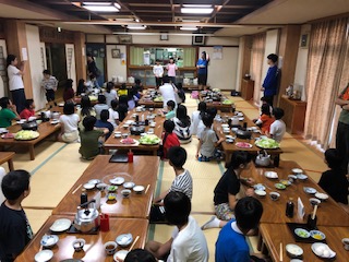 林間最後の夜ご飯を食べています。今日はすき焼きでした。お肉、野菜をバランスよくみんなで食べ、どの班も完食することができました。