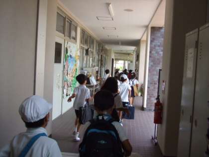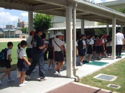 毎年2学期の始業式のあと、避難訓練をしています。今日も4時間目に、台風が接近し暴風警報が発令されたという想定で避難訓練を実施しました。みんな 「おさない、はしらない、しゃべらない、もどらない」の約束を守って行動することができていました。