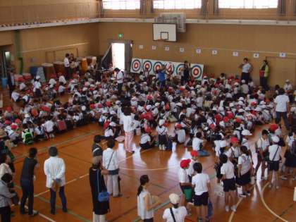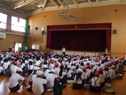 講堂に帰る用意をして体育館にクラスごとに集合しました。まず人員の確認をしてから、地域別に分かれました。