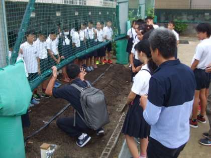 今日は、お天気が心配だったので順番を変えて、まず取り用の畑で「田辺大根の種」の植え方の練習をしました。