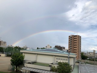 児童が下校する時間帯に雷鳴がとどろき、豪雨となり下校をしばらく待機していました。雨がやんでみんなが下校を始めたころ東の空に「2重の虹」が見られました。とてもめずらしいそうです。