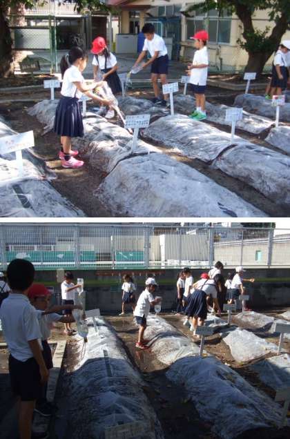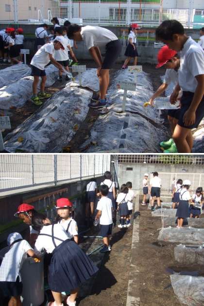 毎年、1年生が慣れるまで6年生が一緒にお世話をしてくれてます。水をペットボトルに入れるところから、畑に水をかけるところまで付き添っている場面が見られました。これからどんどん6年生がリーダーとして、頼もしく感じられるようになります。