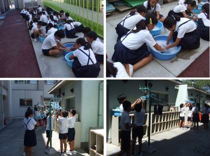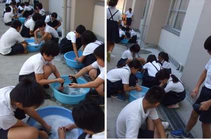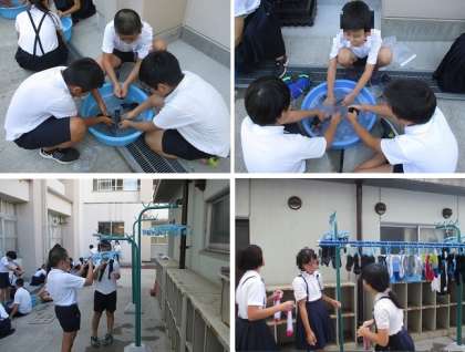 「たらい」を使って手洗いで洗濯しました。日常あまり経験することがないので、みんな興味をもって楽しく活動していました。つまみ洗いやもみ洗いなどで実習しましたが、思った以上に汚れがとれていたようです。