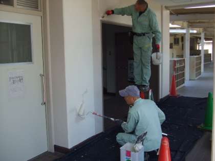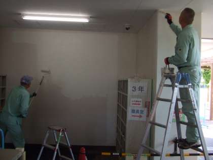 今回は、1階の廊下の壁をきれいな色に塗り替えています。子どもたちが通らないときに、少しずつしています。全部塗り終わるまではもう少しかかるようです。