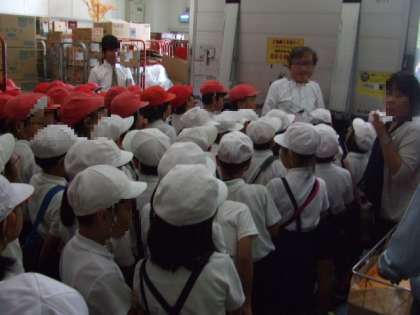 3年生が、「ライフ西田辺店」に社会見学に行きました。普段は見ることのないバックヤードにも入れていただき、鮮魚のコーナーでは1日に魚を100匹も調理することを教えていただきました。冷凍室の中にも入ることができ、その冷たさに驚いた様子でした。