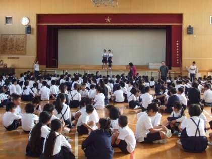 16日(水)の児童集会で、ふれあい班ごとに鶴を折りました。来週の22日・23日に6年生が「ヒロシマ」の修学旅行に持っていく千羽鶴にします。最初に6年生の代表が「ヒロシマにみんなの作った千羽鶴を持っていきます。一緒に作ってください。」と全員に伝えました。