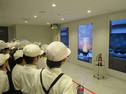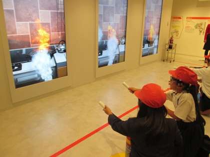 映像や実体験を通して災害の恐ろしさや、災害がおこった後の取るべき行動など学習することができました。全員が消火器を使用して、映像の火災を消す体験することもできました。