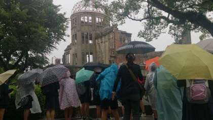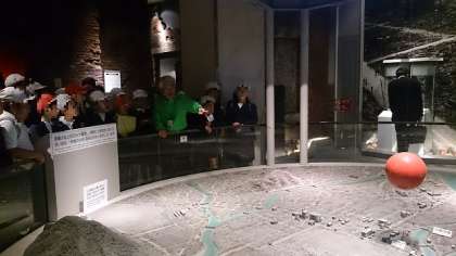 お好み焼きで満腹になったところで、さあいよいよ平和記念公園へ。象徴とも言うべき「原爆ドーム」前に13:20に入り、まずは記念撮影。その後資料館の見学、記念公園内のフィールドワークへとつながっていきます。
