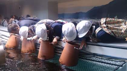 宮島水族館は、水中眼鏡で水槽の中を覗けたり、水槽の背景に自分たちが入って記念撮影ができたりと、水の生き物たちを身近に感じられる工夫がいろいろとなされています。生き物好きの6年生にはたまらないはず。校長先生も子どもたちと一緒に夢中になって覗いてます(写真1枚目)。