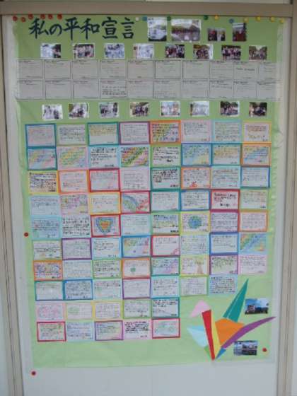 11月の職員室前の掲示は6年生です。6年生は、先週に広島方面へ修学旅行に行ってきました。そのまとめとして、一人一人の思いをメッセージにしました。それを「私の平和宣言」として掲示しました。