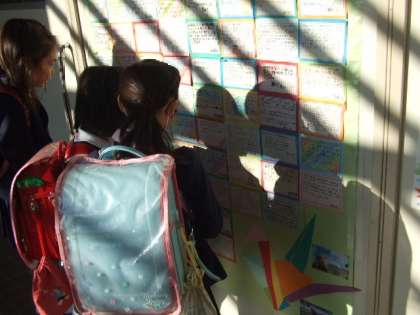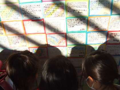 朝、登校してきた子どもたちは、知っている6年生の人のメッセージを探して読んでいました。