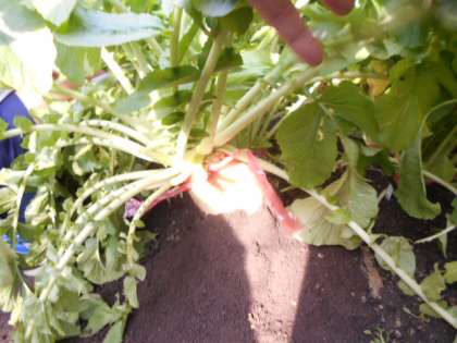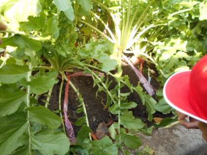 3ヵ月間育ててきたマイ大根です。今年は、いつもよりアブラムシや白さび病などが少なかったようです。立派に育ているように思いますが、こればかりは抜いてみないと分かりません。さあどんな田辺大根が出てくるでしょうか?