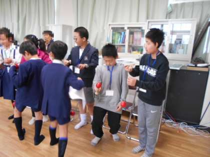 まず、5年生が中国とエジプトについて調べたことを発表しました。そのあと、中国語とエジプト語であいさつやジャンケンで交流しました。「福笑い」や「けん玉」などの日本の遊びをしながらの交流もしました。