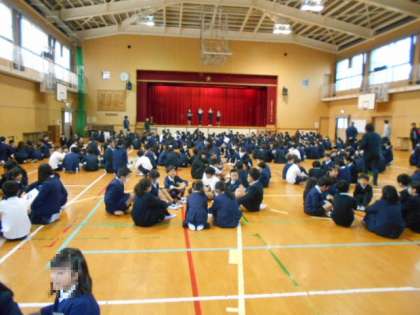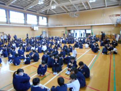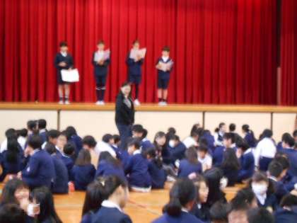 新学期が始まって、最初の児童集会がありました。今日は「身近なものクイズ」でした。日常生活でよく目にするものから楽しいクイズを考えていました。ふれあい班での話し合いで答えを出しますが、どの班も楽しそうに相談をして答えを考えていました。
