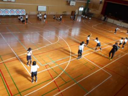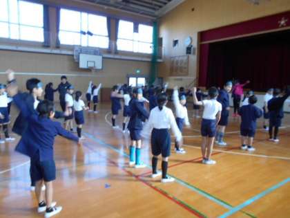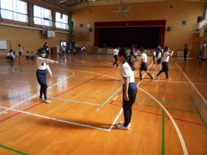 日本ブラインドサッカー協会の方々に来ていただいて「ブラインドサッカー」を学習しました。アイマスクをつけて視覚障がいのある方がどのような状況で生活されているのか、そしてまわりの人がどのように声掛けサポートをすればよいかなどを体験することができました。そして、声と音をたよりにペアの人のところに行くことも、視覚に障がいがあることで、とても難しくなることに驚いた様子でした。