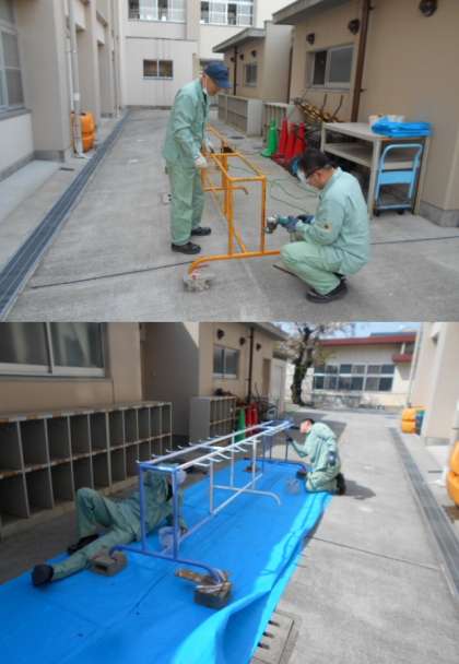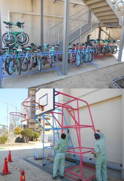 例えば、管理作業員は、みんなが登校してきた時に、楽しく活動ができるように一輪車のスタンドやバスケットゴールをきれいにしています。 みんな楽しみにしていてくださいね。