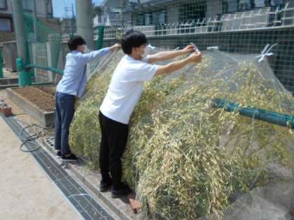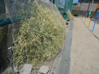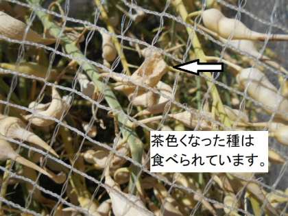 少しずつ茶色になってきたので鳥たちに食べられています。もっと乾燥した種になると、鳥たちの絶好のエサとなってしまいます。そうなる前に田辺大根の上にネットをかけました。