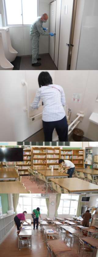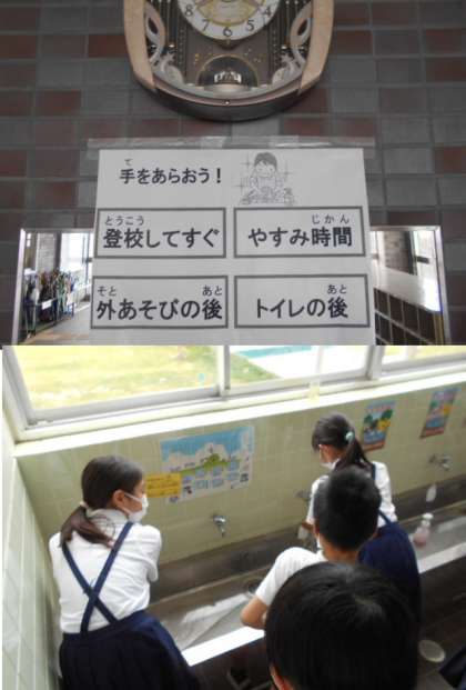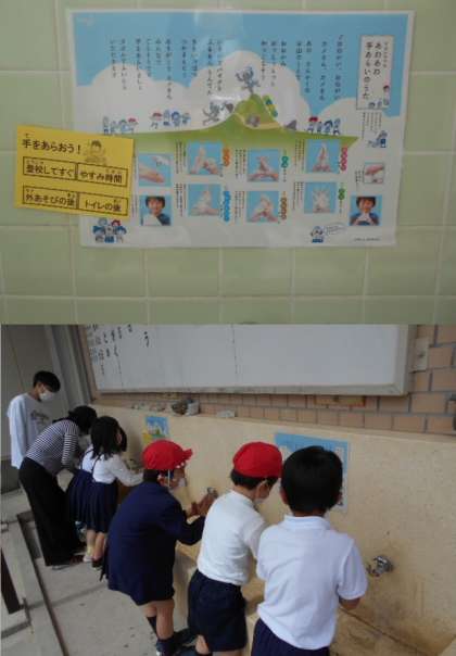 色々な場所に貼ってあるポスターを見ながら、しっかり手洗いをするようにしています。毎日、担任・養護教諭・管理作業員や協力できる職員で、みんなが触れる場所を消毒するようにしています。