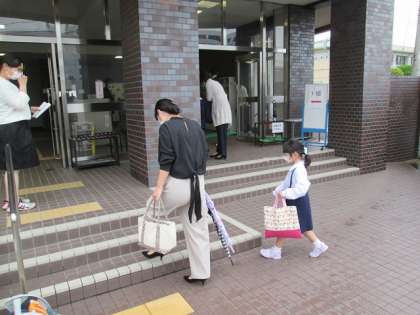 本日、1年生の児童と保護者の皆様が安心して本校へ登校できるように「入学にかかるオリエンテーション」を実施しました。雨が降ったりやんだりするお天気でしたが、1年生の皆さんは元気に登校してきました。