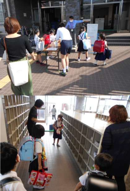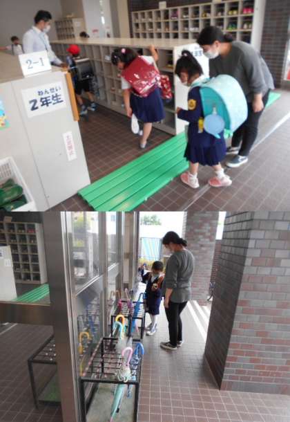 今日、初めて1年生が登校してきました。元気よく「おはようございます。」とあいさつをしていました。まだ自分の靴箱や教室がはっきりと分からないので、今日は職員が玄関から案内をしました。次からは、一人でがんばりましょうね。