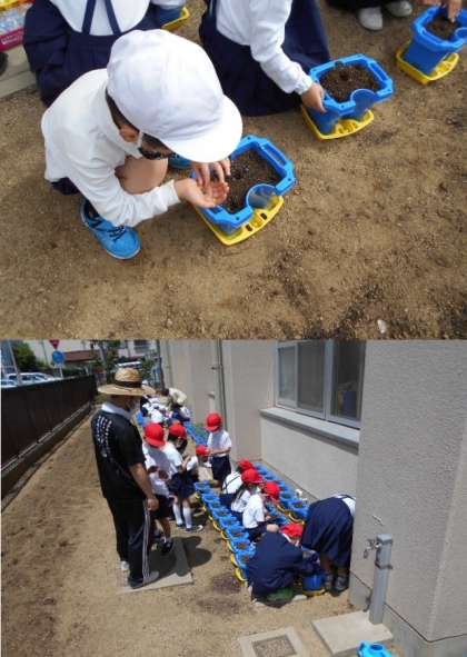一人5粒ずつ植えるので、指で5つ穴をあけてそこへ種を入れました。土を軽くかぶせました。肥料を上において完成です。来週からは1年生がペットボトルで水をあげる予定です。きれいな花が咲くようにがんばりましょう。