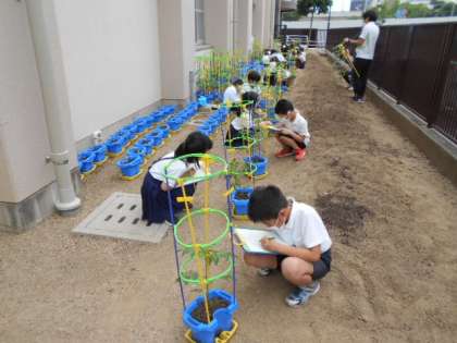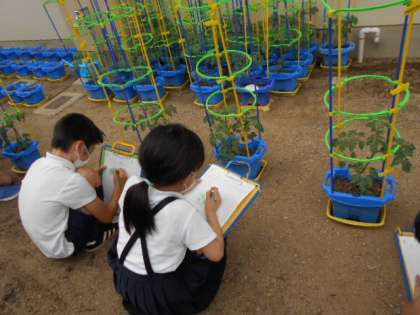 今日は、2年生が「ミニトマト」の観察をしました。校舎の南側に置いてある一人一鉢の「ミニトマト」をくわしく観察してプリントに書いていました。葉の大きさや形の特徴を上手に書いていました。
