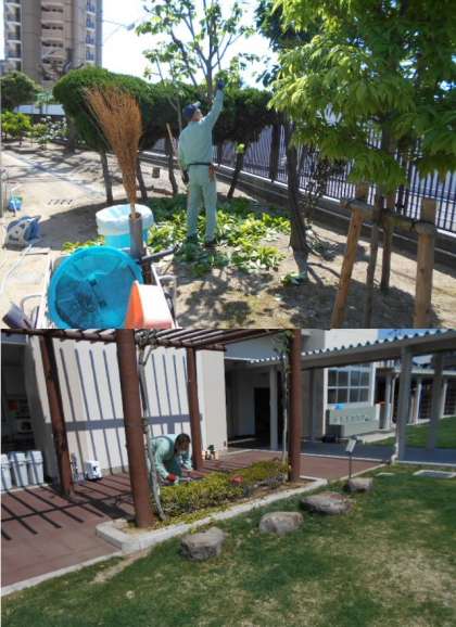 例えば、管理作業員は、気持ちよく学校生活ができるように、草木の剪定をしたり花を植えたりしています。