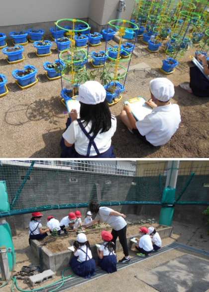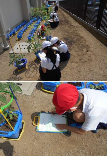 南側の鉢に植えたミニトマトも、黄色い花が咲き始めました。みんなよく観察して絵や言葉でまとめていました。