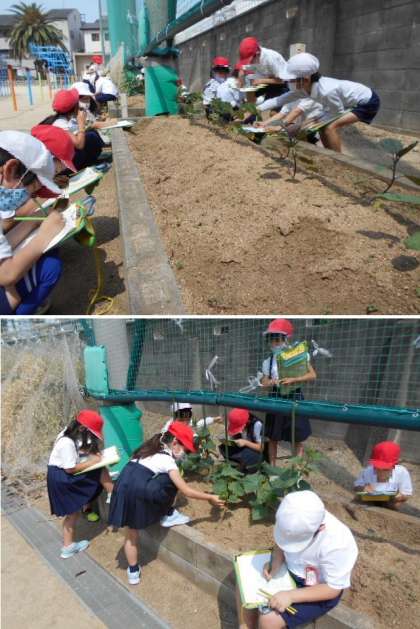 2年生が育てている植物が、ぐんぐん大きくなっています。農園では、枝豆とキュウリを育てています。触ってみると「チクチクする」「ふわふわしてた」などの感想が聞かれました。