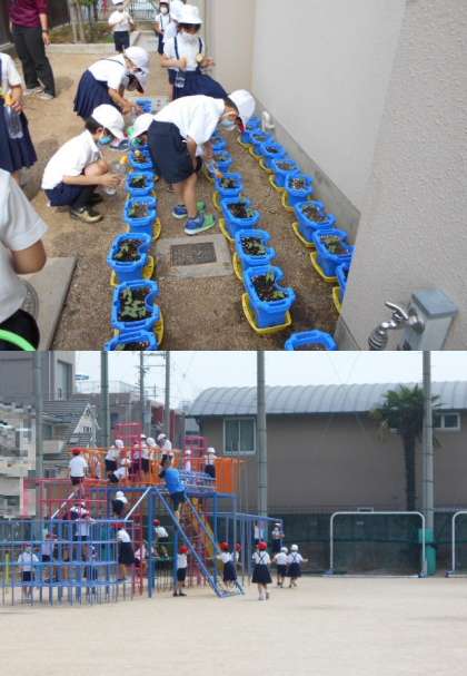 今日も暑い日になりましたが、子どもたちは元気に活動しています。これからも暑い日が続きそうですので、水筒・タオル・赤白帽子を忘れないで持ってきましょう。
