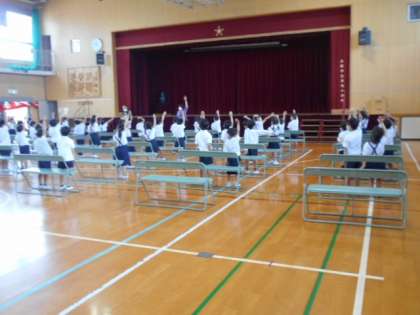明日は、9時55分講堂に入場、10時開式となりますので、9時40分までに教室に上がれますよう登校してください。よろしくお願いいたします。