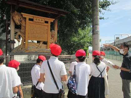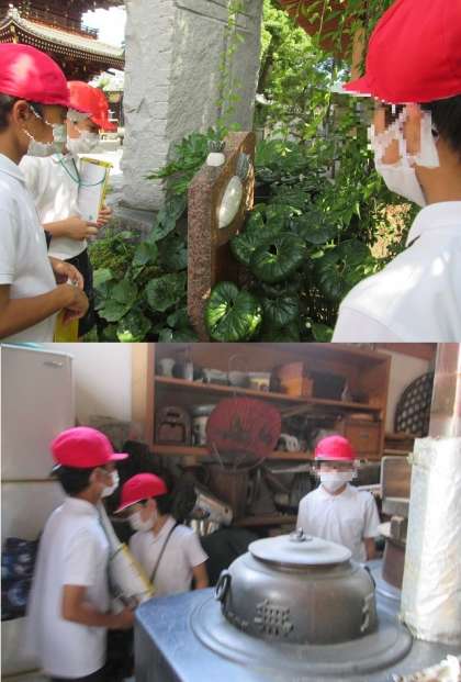 法楽寺には、田辺大根ゆかりの地ということで碑が建てられています。昔、お寺の外は一面畑で、土は田辺大根に適していたのでとてもおいしい大根がとれたそうです。学芸員の方にもくわしく説明していただきました。また、昔の道具なども見学させていただきました。