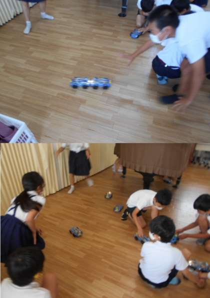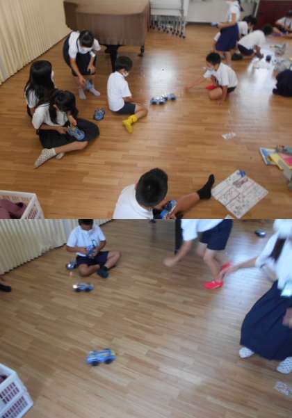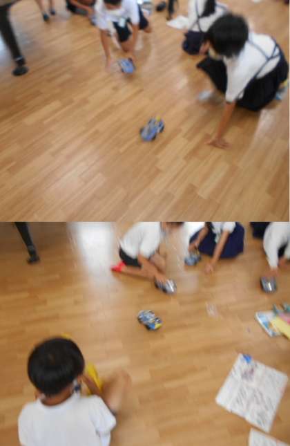 理科室では走らせるスペースが少ないので、今回は多目的室で学習しました。完成した人から走らせていました。とても楽しそうでした。中にはどちらの車が強いか、押し合いをしている人たちもいました。