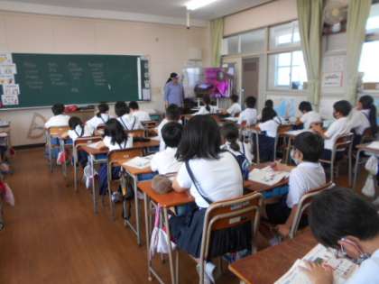 最後に、昨年度より来ていただいていたC-NETの先生が帰国されることになり、全児童に「お別れのことば」がありました。楽しく英語を教えていただいて、ありがとうございました。
